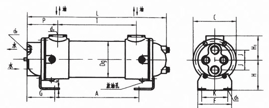 型號(hào) | 換熱 面積m2 | Dg | C | L | T | P | H1 | G | A | H | F | K | d5 | d2 | d1 | J | 重量 (kg) |